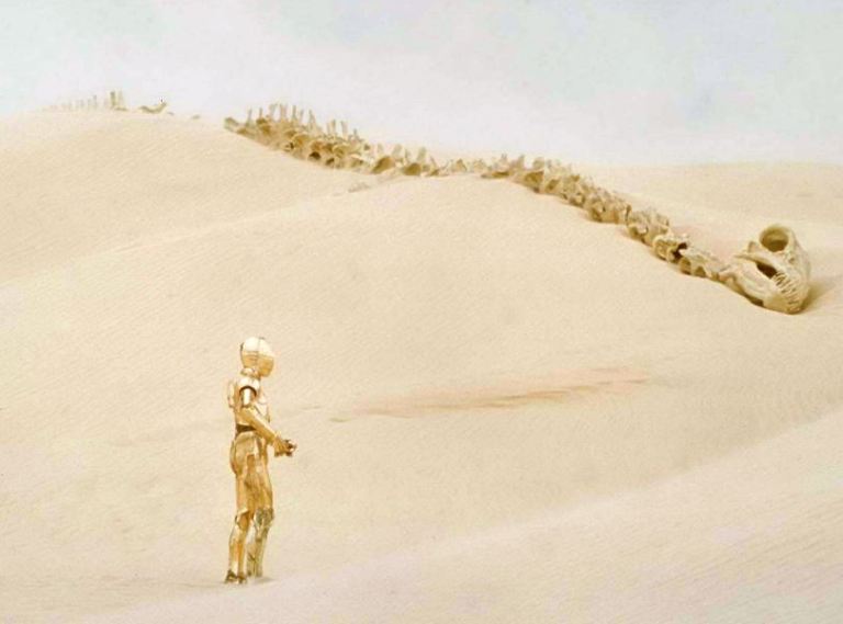 En la película de Star Wars: A New Hope, muchas cuestionantes se abrieron desde esa escena en Tatooine, donde se ve el esqueleto de lo que aparenta ser un dinosaurio. Bastante tiempo ha pasado e historias subsiguientes nos han dado algunas respuestas. No se trata de un dinosaurio, si no mas bien de un Krayt Dragon.